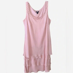 Dress: - Scoop neck - Sleeveless - Beaded neck - Tiered hem - Slips on over head - Lined