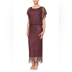 SLNY Fringe Hem Crochet Blouson Long Dress in fig color size 6