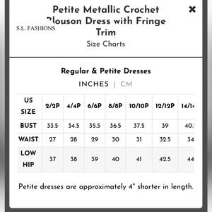 This Metallic Lace Crochet Dress with Fringe Hemline is Fully lined and has some stretch.