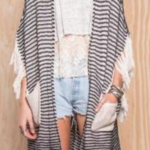 For the boho girl in you this timelessly chic with fringe details, black and cream striped, Open front sweater kimono / cardigan with pockets is a must have! On trend and easy to wear over any outfit, with jeans and a tshirt, over your boho dress or style as seen in pics. pair with our black denim crochet shorts.