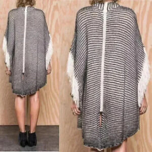 For the boho girl in you this timelessly chic with fringe details, black and cream striped, Open front sweater kimono / cardigan with pockets is a must have! On trend and easy to wear over any outfit, with jeans and a tshirt, over your boho dress or style as seen in pics. pair with our black denim crochet shorts.