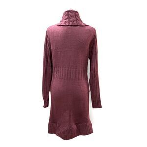 This is a very nice longline double breasted cardigan sweater with snap front closure— maroon color — 100% acrylic, hand wash — so pretty, excellent condition — worn very gently to 2 occasions —