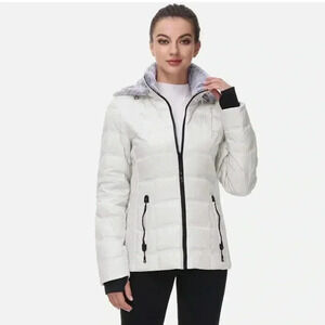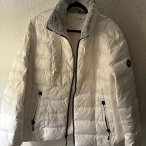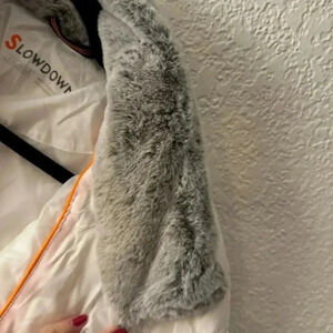 SLOW DOWN Women Down Puffer Jacket Winter Down Puffer , Size: XXL, Color: White with charcoal fur. Great condition - 1 flaw a few spots on right arm under logo shown in photos.