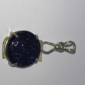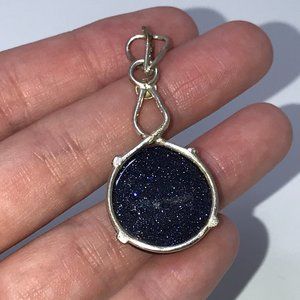 Round blue goldstone pendant set in silver plated copper. 20.5 mm round 1 3/4” Long. This is a beautiful, simple wire and blue goldstone pendant. I can hand polish it before shipment. This pendant weighs 5.66 grams.