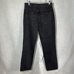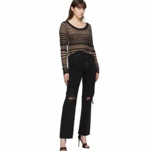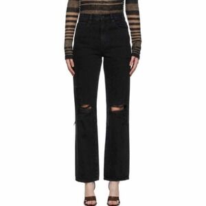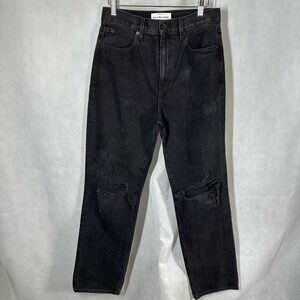 SLVRLAKE Black Distressed High Rise Straight Leg London Jeans Size 28. Pre owned and in excellent used condition with minimal wash wear. Distressed all over at the front, trims and in the hemline. 5 pocket styling, zipper fly with button for closure, fading details. Measurements are approximates only. Non stretch denim.