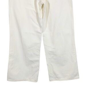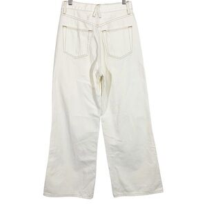 Features: 100% cotton denim fabric in Natural White. High waist. Wide leg. Contrast stitching. Pockets. Zip to button closure.