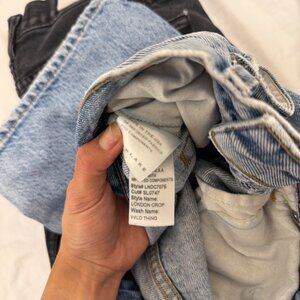 100% cotton. Made in USA. Dry clean only. Zip fly with button closure. 5-pocket styling. Light whiskering and washed detail throughout. Our Style No. LKSL-WJ86. Manufacturer Style No. LNDC707S.