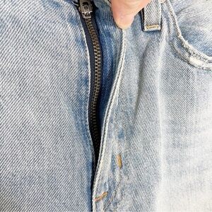 Zip fly with button closure, manufacture whiskering and fading, manufactured light staining throughout, ripped details, light- medium wash. 100% cotton.