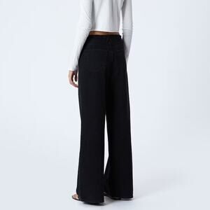 High-rise fit, wide-leg cut, belt loops, five pockets, unfinished frayed waist, pleated details at waist, faded finish