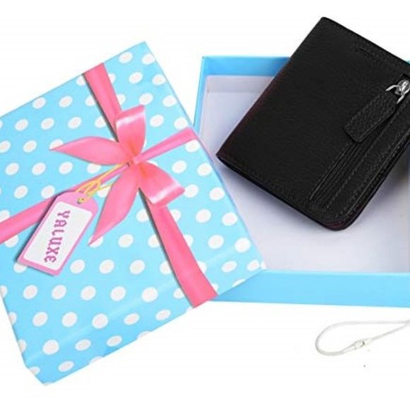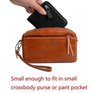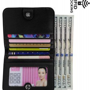 SMALL BLACK BI-FOLD HAS OUTER ZIPPED POCKET. HAS I.D. WIDOW AND SLOTS FOR SIX CREDIT CARDS. AND A LARGE POCKET FOR CASH AND A CLASP TO HOLD IT CLOSED. 3,5" X 4" - SMALL ENOUGH FOR A COAT POCKET. EXCELLENT GIFT !