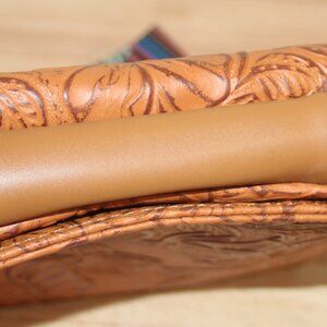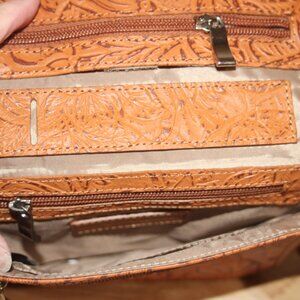 This is a cute, small concealed weapon bag. Embossed leather. The front flap closes magnetically. Under that flap is the main compartment, plus a zippered pocket beneath it and another zippered pocket on the inside side of the flap. Plus there is a slip pocket beneath that zippered pocket that closes with velcro. When you flip the bag over, there is a 3/4 zip around pocket that is where the weapon is carried. The original carry strap was replaced with this fun wide multi colored adjustable strap. It measures approximately 6 1/2" tall and 9" wide. In excellent condition.
