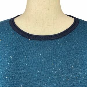 Color-block pattern: body is deep jewel-tone teal with colorful flecks; sleeves and collar/hem are navy blue