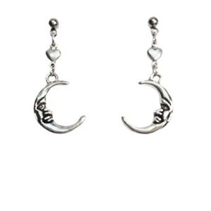These adorable earrings are constructed of .75 inch crescent moon charms, suspended from tiny hearts and half moon, hypoallergenic silver posts. Drop length is 1.75 inches. Lead and nickel free. Complimentary gift with purchase.