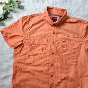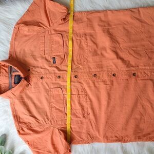 Workwear button down salmon short sleeve shirt in a men's size medium. Measurements are in photos. Please see all the photos as this is the exact coat you will receive. Thank you so much for looknig. I am always open to reasonable offers. Have a fantastic day!