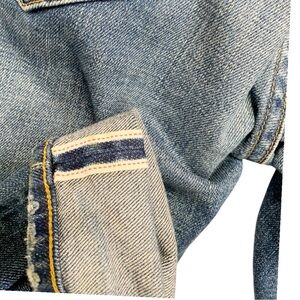 Features: 100% japanese selvedge denim in a light medium wash. Factory distressing and discoloration. Mid rise. Slim straight leg. Pockets. Zip to button closure