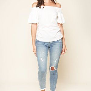 Lightweight, woven fabric falls from a smocked, off-the-shoulder neckline, into short, flutter sleeves. Fitted bodice finishes at the slightly cropped hem. Pair with jeans and wedges for a full look! This Top is so versatile and cute!!! It runs slightly Small so if you are between sizes you might want to size up.