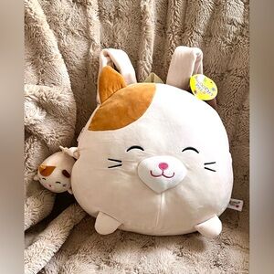 Adorable cat plush backpack with a matching keychain. Features cream and brown colors. Perfect for cat lovers.