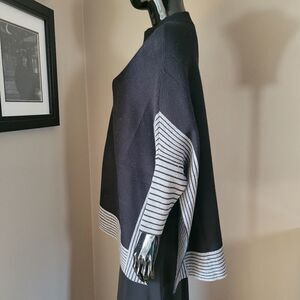 Size S/M. Unique oversized cape style sweater. Black body trimmed with black and grey stripes on the sides and cuffs. Bought but never worn. Been hanging in my closet since I brought it home. Time for it to find a new home.