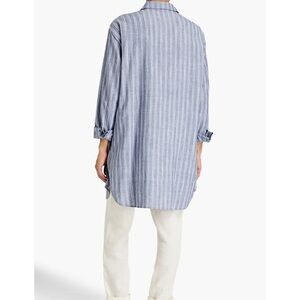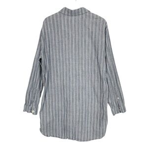 Features: 100% cotton fabric in blue and white stripes. Collared. Oversized tunic style fit. Side slash pockets. Long sleeve with button cuffs. Button front closure.