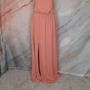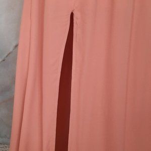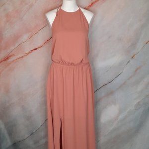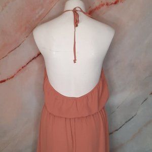 Rustic mauve crisp color. Heather halter dress. Elastic waist. Front side slit. Halter straps tie at back of neck. Mini Skirt length lining. New without tags