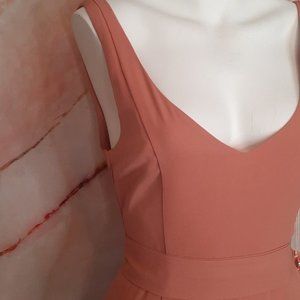 Rustic mauve color. Full length lining. Flattering cut v-neckline and back. Small zipper in back. Has tie/ sash. Maxi length. Model photos from website differ from actual color.