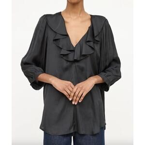 This SMYTHE Over the Head blouse is an effortlessly elegant staple designed with intentional detail and timeless sophistication. Crafted in a luxe, fluid black fabric, this top features a romantic ruffled V-neckline, softly pleated bishop sleeves, and a relaxed silhouette that drapes beautifully on the body.