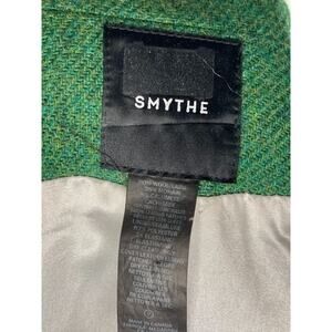 Women's blazer by SMYTHE. Size 10. Duchess blazer with suede elbow patches. Gorgeous green color. Single button closure. Pockets. 60% wool, 35% mohair, 5% cashmere. Good condition, no stains, holes or pilling. Lining has several picks/snags, mostly at one underarm, a few randomly throughout. Does not show when worn.