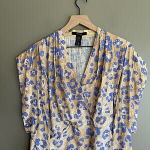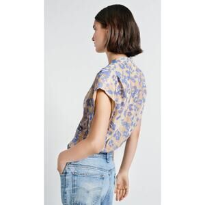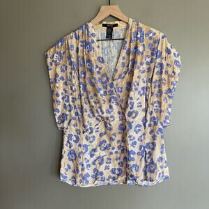 SMYTHE Yoda Top in Metallic Lavender, Size XS, Double Breasted Blouse, Champagne Light Gold Cream Tan Beige Blouse with Purpleish Blue Leopard Print and Tonal Metallic Accent Throughout, Wrap Style Double Breasted V-Neck Neckline, Short Sleeves with Dropped Armholes, Relaxed Fit, Excellent Condition with Very Small Mark Near Shoulder, As Shown in Photos.