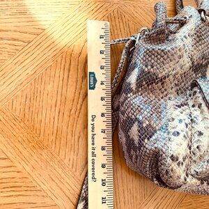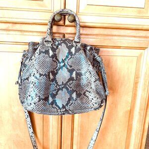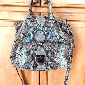 A distinctive snakeskin coated bag by Michael Kors. Wear it as a shoulder cross body bag with the strap or carry it with the handles. Lots of storage and a handy flap pocket in the front. The interior has multiple pockets for ease of storage including one zippered one. The front is closed via a strong magnet and there is a way to cinch it tighter should you wish. A great bag at a great price.