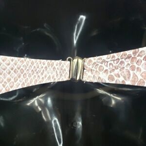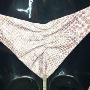 The 2 piece has a snakeskin pattern throughout, the top has a clasp for closure in back with removable pads, the bottom has a rouched back for a sexy look. Excellent condition.