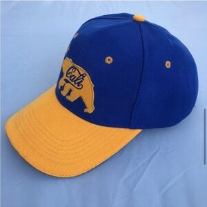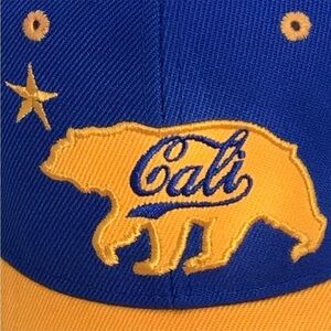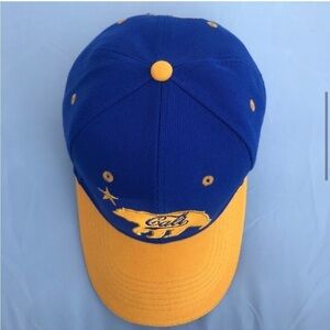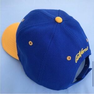 E8 Hat/Cap Smith Novelty Company SNC Division of Smith News Company Adult Adjustable Hook & Loop Strap "Cali" Bear Logo in yellow/blue patch on face and California type in yellow on rear / 2 tone Blue dome Gold Bll with gold accents 100% Acrylic