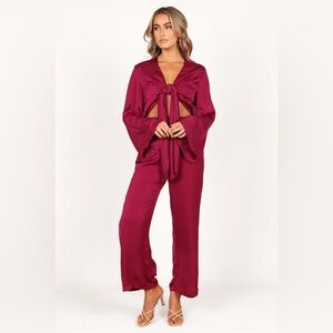 Get ready to turn heads in this luxe magenta jumpsuit! Long sleeves meet a classic V-neckline with a cute front tie, finished in a stunning satin sheen. The waist cut-out detail adds a playful twist while the back elasticised waistband and invisible side zip ensure a perfect fit.