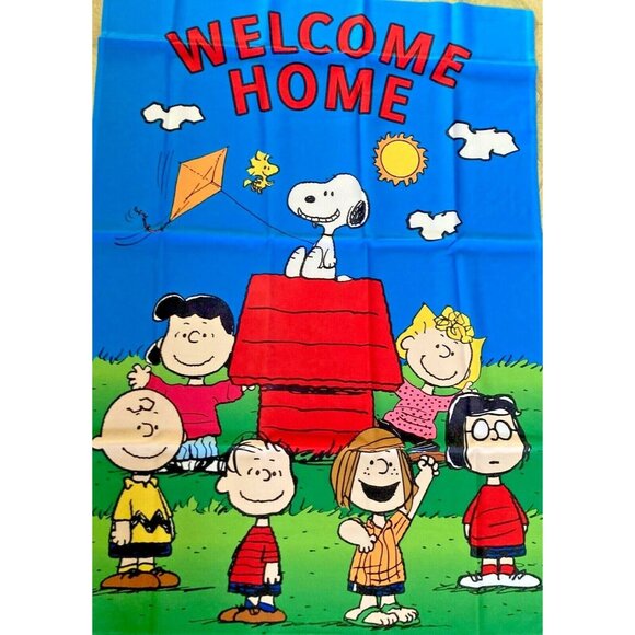 SNOOPY PEANUTS Flags "WELCOME HOME". The Peanuts gang are flying kites on a blustery spring day ! This flag is a "house" flag- the larger size - 28 " x 40". Does NOT include flagpole. From a nonsmoking environment.