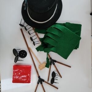 3 spray bottles to spray color on snow (food color not included); 2 snow/sand block molds (10x5x5); 2 snowball forms. Snowman kit with button eyes, coal buttons, 3 scarves, 2 twig arms, corn pipe, plastic top hat (has a slit in that's been taped from inside).