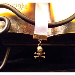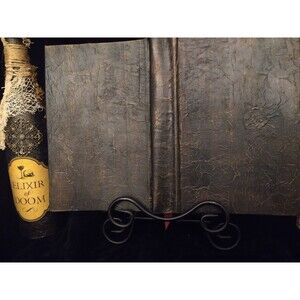 Aged to perfection with gold highlights....this "open" spell book will look wonderful displayed on an easel, book holder or propped on a shelf. Adorned with green dried moss, red ribbon bookmark with a brass skull and crossbones and a little mini spider.
