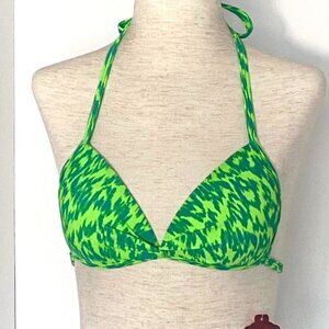 So Bikini Swimsuit Halter Top Ruched Center Neon Green/ Darker Green Animal Print Lined Formed Cups