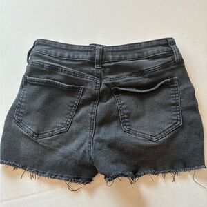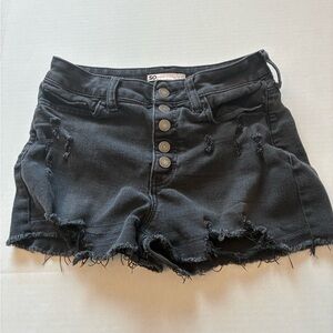 Stylish black jean shorts with distressed details. Features button fly and frayed hem. Ideal for a trendy look. Used condition