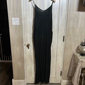 This SO black jumpsuit showcases a relaxed fit with wide-leg pants and thin spaghetti straps, offering a sleek and timeless look. The soft fabric drapes naturally, making it a comfortable choice for any occasion. Its minimalist design ensures it can be easily dressed up or down. *Missing belt.