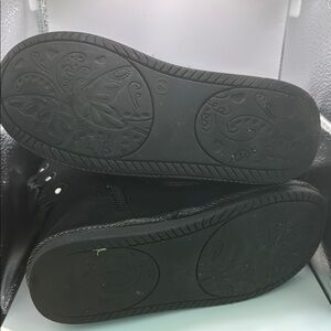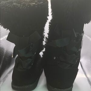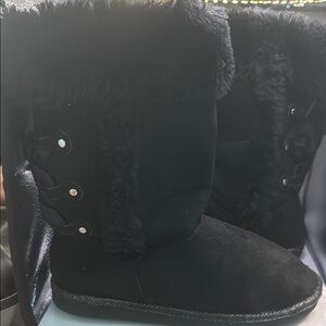 These SO black boots are crafted from a soft suede-like material, offering a comfortable slip-on design. With a rounded toe and a thick, flat sole, they provide both style and practicality for everyday wear. Perfect for casual outings, these boots are a versatile addition to any wardrobe.