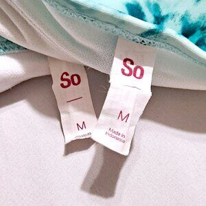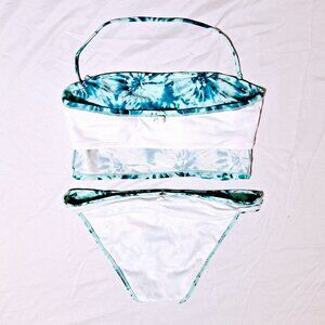 Trendy and fun two-piece swimsuit from SO, featuring a vibrant blue and white tie-dye print. The bandeau-style top comes with an optional halter strap for extra support, and the matching bottoms have a flattering thick waistband and a mid-to-high cut fit.
