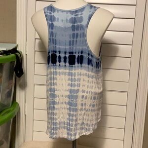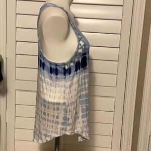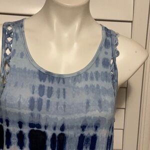 This SO tank top features a vibrant blue and white tie-dye pattern, offering a stylish sleeveless design perfect for warm weather. The lightweight fabric and classic scoop neckline make it an ideal choice for casual outings.