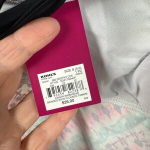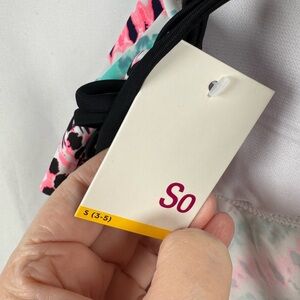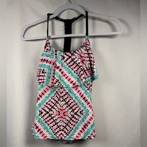 This SO Braided Back Flounce Tankini Swim Top is brand new and has the original tags attached. It is a multi-color top and junior's size small (3-5).
