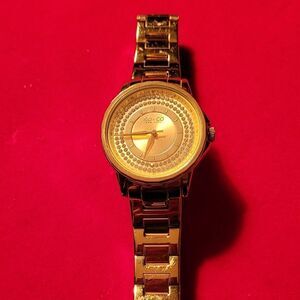 Statement and stylish rose gold watch with two concentric circles of crystals. Push button deployment clasp. Alloy bezel and case. Screw down fluted crown. Japanese quartz movement. Bracelet is 16mm wide and 7. 75" long. NWOT.