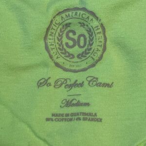 SO Authentic America Camisole Tank Tops in a Lime Green Jersey Knit. It is a Scoop Neck, Sleeveless Shirt with Adjustable Spaghetti Straps and a built in Shelf Bra .