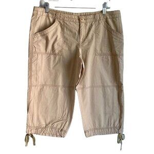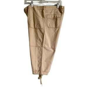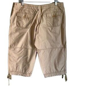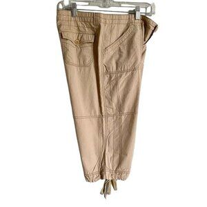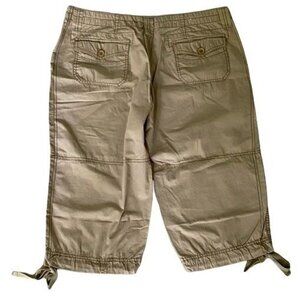 SO Capris Pants. 2 front and 2 back pockets, button and zipper closure, ties at bottom of each leg. 100% Cotton. Size 13 with approximately measurements laying flat: length 26", 17.5" waist, 18" inseam, 9" rise.