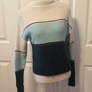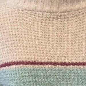 SO Colorblock Waffle Knit Sweater. Mock turtle neck, waffle knit sweater in cream, mint and teal colorblock with cranberry color stripe. Fairly light weight, long sleeve. 93% polyester, 3% spandex for a touch of stretch, 4% other fiber. Machine wash. Pre-loved though not worn often. Please see photos of dark teal block. Appears to be pilling but seems to be the nature of the fabric.