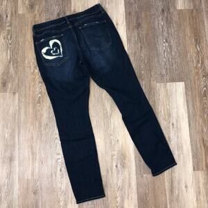 Dark wash denim. Five pocket style. Factor distressing and whiskering. Custom bleach dyed with heart motif. Single heart in front pocket and double heart on back pocket. Not another one like them in the world!
