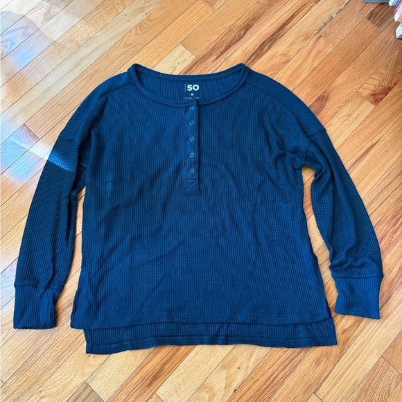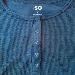 Dark blue top with ribbed texture. Features buttoned front. Made by SO. Elena Gilbert Bella Swan twilightcore Y2K TVD henley aesthetic top