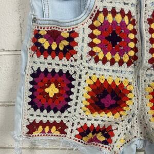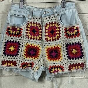 SO® Denim Crochet Shorts. These cut-off shorts feature colorful crochet granny squares and light-wash size 26(3). Approx. measurements 26” waist, 10” rise, 3” inseam.