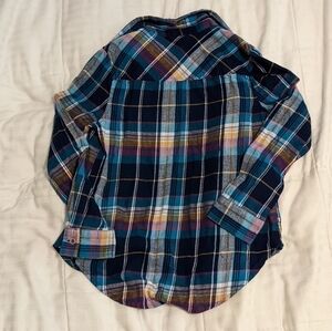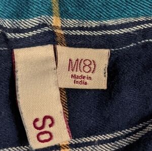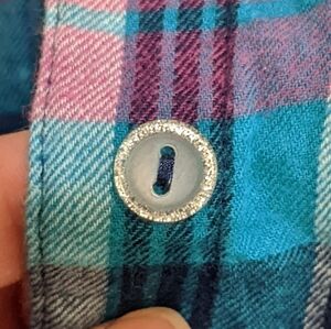 So Brand Flannel size Medium (8). The buttons have cute subtle sparkles on them and the color is a pretty blue, pink and yellow. perfect for back to school!!